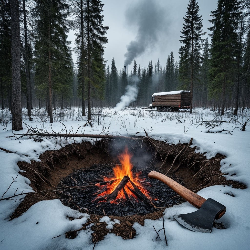 В Коми, километрах в тридцати от Усть-Кулома, стояла старая делянка. Работали там пятеро — мужики из Лоймы, сезонники. Место тихое, ровное, елки крупные, лес густой. Только почему-то никто туда раньше не лез, хотя лес — первый сорт, бери не хочу. Бригадиром был Платон, здоровяк лет под шестьдесят. Отслужил, потом всю жизнь на валке. С ним работали братья Корниловы — Василий и Гена, шустрые, молодые, могли целый день махать без отдыха. Был еще Сашка Дым, молчун, тракторист, и повариха их — Алёна, вахтовая, из Вуктылы. Жили они в вагончике, ставили печку, вечерами чай, карты, байки. Вроде всё как обычно. Пока однажды ночью не услышали гул. Не ветер, не зверь — а будто земля под полом гремит, как поезд где-то внизу. Три раза — и тишина. Утром Платон пошёл осмотреться. У подножия делянки — ровный круг, будто мох провалился, снег туда осел. В середине торчал корень ели, черный, как обгоревший. Платон ткнул ногой — земля мягкая, поддаётся. И запах пошёл… тёплый, тяжёлый, как гниющ