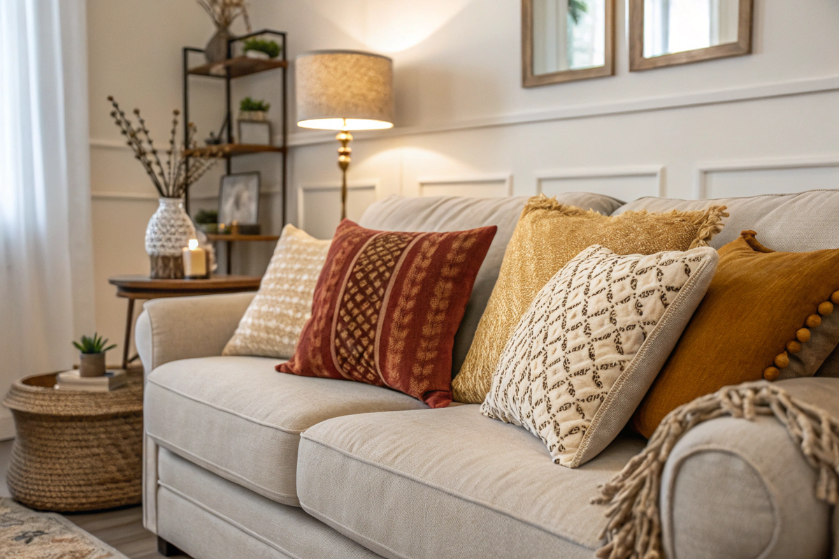 Сочетание фактур и узоров — это то, что превращает набор подушек в композицию. Представьте: вы заходите в комнату, видите диван и хотите тут же зарыться в эти подушки. Вот это и есть магия правильно подобранных текстур. Бархат рядом с грубым льном, гладкий сатин рядом с вязаным плюшем — эти контрасты создают тактильное разнообразие, которое считывается даже визуально.