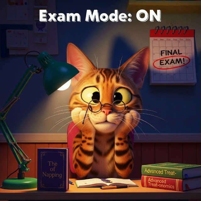 Наступает это время года... Время бессонных ночей, гор учебников и нервного тиканья часов. Сезон выпускных экзаменов! И наша дорогая Фаня, как и любой прилежный студент, ощущает на себе все бремя ответственности. Подготовка к экзаменам идет полным ходом, и ей нужно study hard (усердно готовиться), если она хочет получить хорошую grade (оценку). Только посмотрите на нее: сидит под светом лампы, подперев мордочку лапками, а в глазах - вселенская усталость и тревога. На календаре красным обведен самый страшный день - Final exam (итоговый экзамен). Главное испытание в ее расписании - экзамен. Самый большой страх Фани - не набрать passing mark (проходной балл). She worries: "What if I fail an exam? The horror!" (Она беспокоится: «Что, если я провалю экзамен? Какой ужас!») Test (тест) состоит из двух частей. Сначала - oral exam (устный экзамен), где ей нужно продемонстрировать самое тихое и умиротворяющее мурлыканье. Комиссия будет оценивать тембр, громкость и способность усыплять с первых т