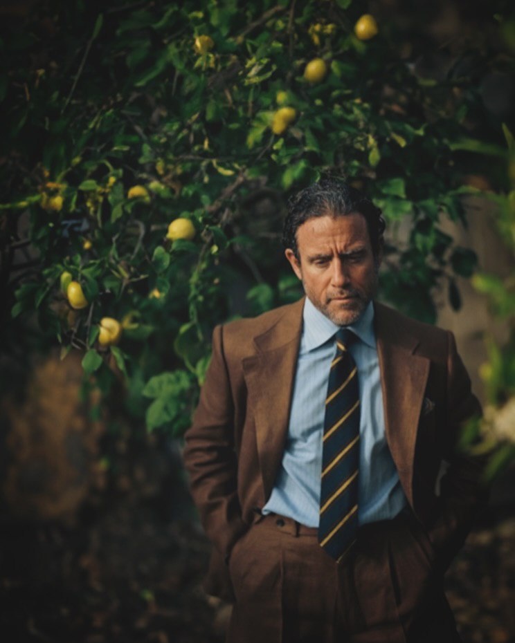 Джентльмен позирует в льняном костюме табачного цвета. Из чего это сшить?