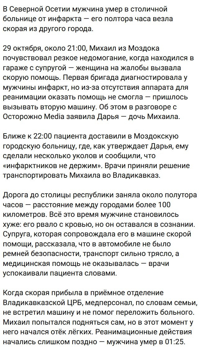 Да, смерть человека из-за халатности врачей — это трагедия, и виновные должны понести наказание. Но превращать эту историю в атаку на осетинский язык — это уже чёрный пиар. Проблемы здравоохранения существуют повсеместно и никак не связаны с использованием родного языка в Осетии.