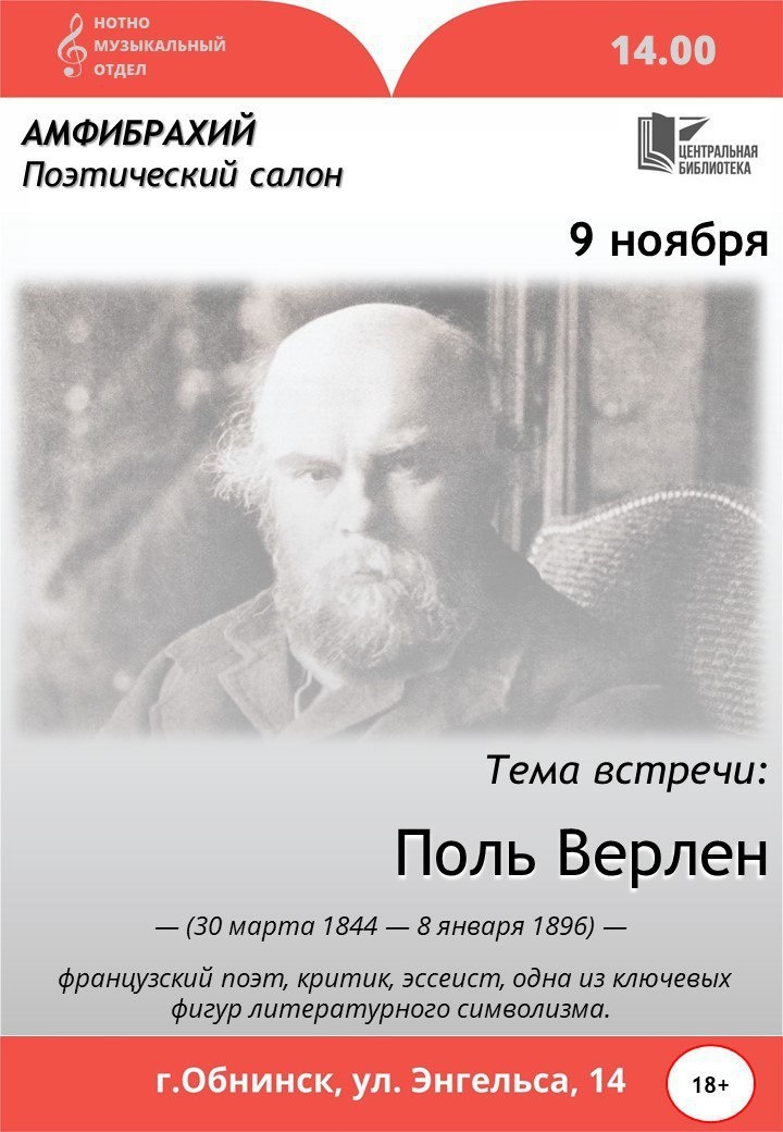👥9 ноября в 14:00 в Центральной библиотеке состоится встреча поэтического клуба «Амфибрахий», посвящённая Полю Верлену