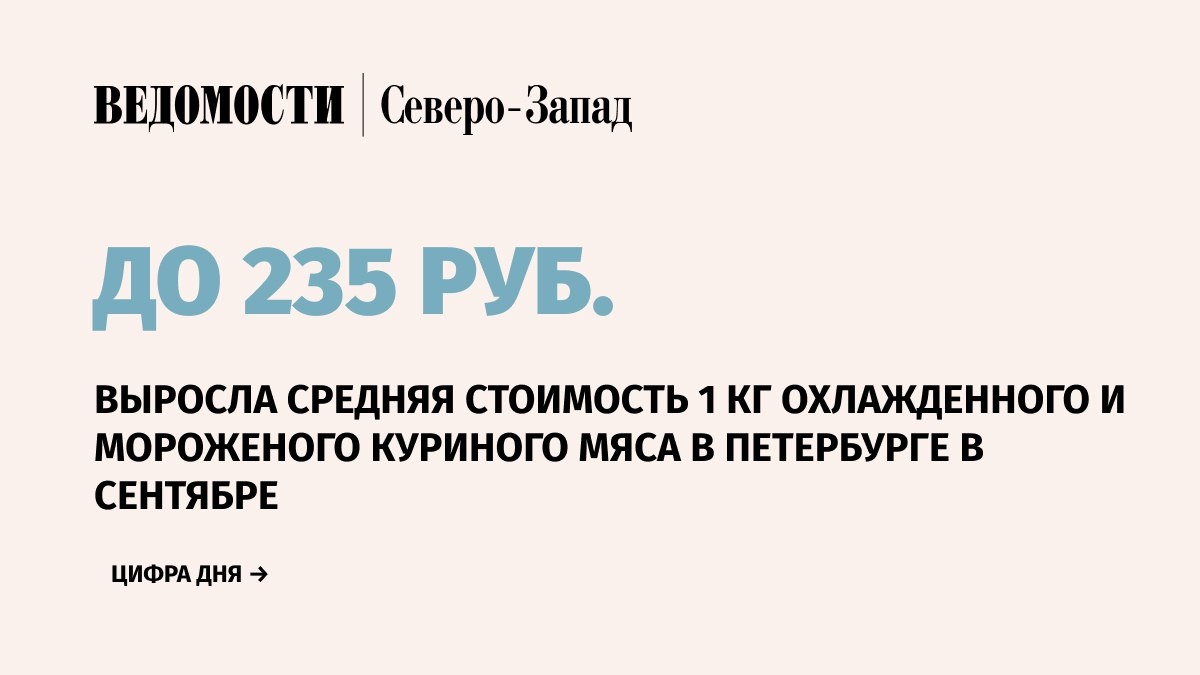 Стоимость охлажденного и мороженого куриного мяса в сентябре выросла в Петербурге сразу на 2,1%. Если в августе цена за 1 кг продукта составляла в среднем 230 руб., то в сентябре она выросла до 235 руб., следует из данных Петростата. В конце 2024 г. 1 кг куриного мяса стоил 229 руб.