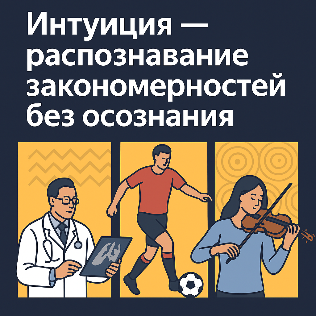 Интуиция позволяет быстро распознавать закономерности и принимать решения на основе опыта, усвоенного без осознанного анализа. Этот опыт формируется через имплицитное научение — процесс, при котором человек постепенно усваивает структуру окружающей среды без намеренного обучения и без концентрации на каждом шаге. При повторяющемся взаимодействии с ситуациями человек получает обратную связь и вырабатывает внутренние шаблоны действий и реакций. Эти шаблоны сохраняются в памяти и автоматически срабатывают в подходящих обстоятельствах. Когда появляется новая, но схожая ситуация, решение формируется мгновенно, хотя сознание не отслеживает все промежуточные шаги. На практике этот процесс проявляется в разных сферах. Врач, мгновенно определяющий диагноз, опирается на тысячи случаев, с которыми сталкивался ранее. Он не анализирует каждый симптом по отдельности, а распознаёт знакомую конфигурацию, закреплённую опытом. Спортсмен реагирует на сложные комбинации соперника без последовательного обд