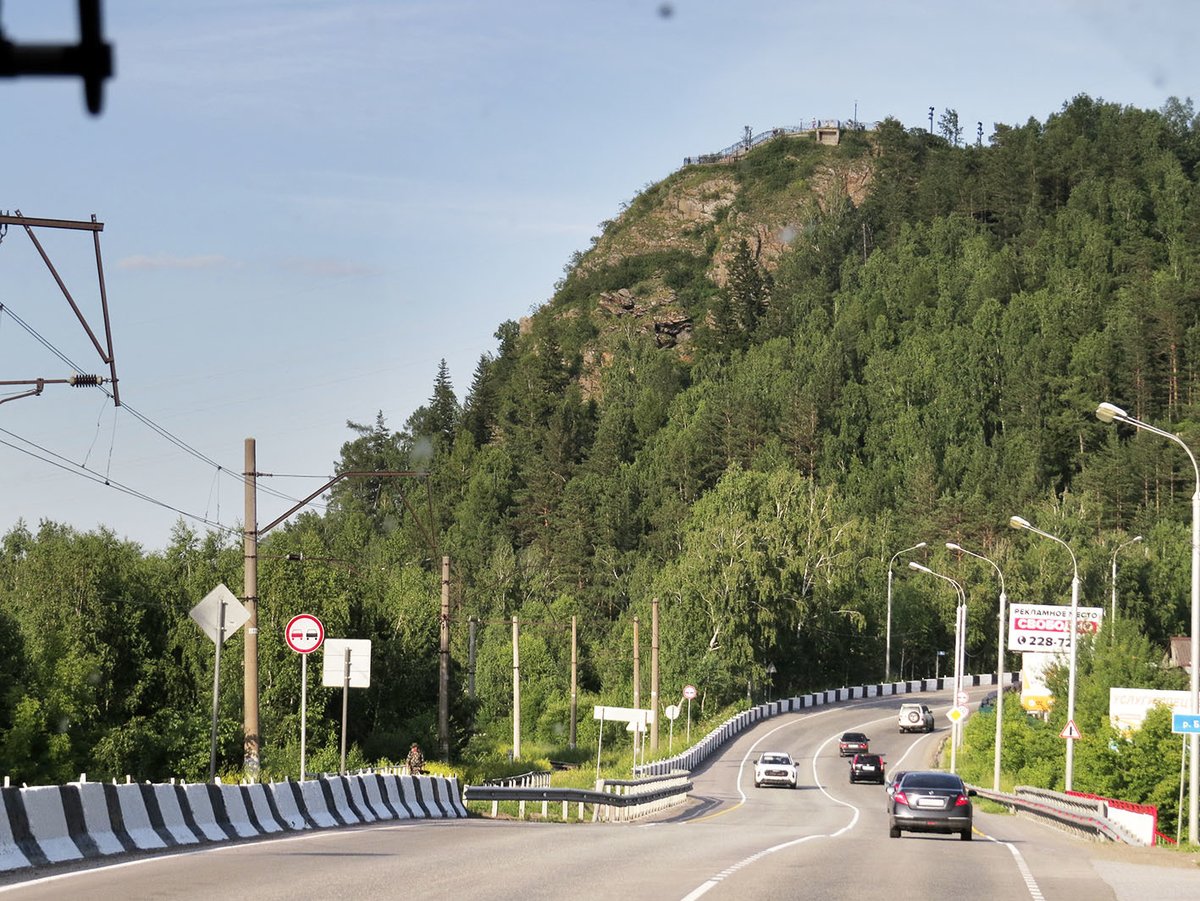 Над платформой Слизнево со стороны Красноярска грузно нависает Слизневский бык (быками на Енисее называют приречные утёсы), увенчанный заметной издалека смотровой площадкой: До спуска на серпантин Беличий Хвост с трассы можно свернуть на парковку в окружении сувенирных лавок, кафе и инфостендов. Памятный камень на её краю - Петру Старовойтову, который в 1970-2007 годах возглавлял дорожное хозяйство Красноярского края, и в том числе вот эту вот дорогу пробивал. Но коллегу своего дорожники увековечили просто в самом людном месте. Ведь смотровая площадка на скале имеет официальное название - Царь-Рыба, а 4-метровый памятник оной встречает наверху: И сам рассказывает гостям, для чего это всё. За Слизневским быком лежит, натурально, Астафьевская долина: Смотровая парит высоко над Енисеем, который здесь уже весьма могуч - до того берега почти 800 метров: Вид вниз по течению, где вдалеке белеет Красноярск: В ультразум можно различить всё те же Гремячую гриву, Успенский монастырь под ней и хр