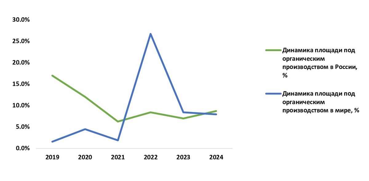В ходе исследования, проведенного NeoAnalytics на тему: "Российский рынок органической продукции: итоги 2024 г., прогноз до 2028 г.", выяснилось, что российский рынок органического производства в настоящее время активно развивается. Усиливается конкуренция, диверсифицируется ассортиментное предложение, все больше потребителей выбирают данную продукцию. Соответственно, основными факторами, влияющими на развитие рынка, являются популяризация здорового образа жизни и употребление экологически чистых продуктов питания, недоверие к генетически модифицированным продуктам и страх перед возможными последствиями их употребления и др. Необходимо отметить, что постепенно меняется модель поведения потребителей на рынке. В настоящее время можно фиксировать переход от «сберегающего» к «рациональному» потреблению. То есть идет медленная трансформация от экономии к избранным покупкам. Но, по-прежнему, ценовой фактор является приоритетным. В 2024 г. в России площадь сельскохозяйственных угодий, занятых