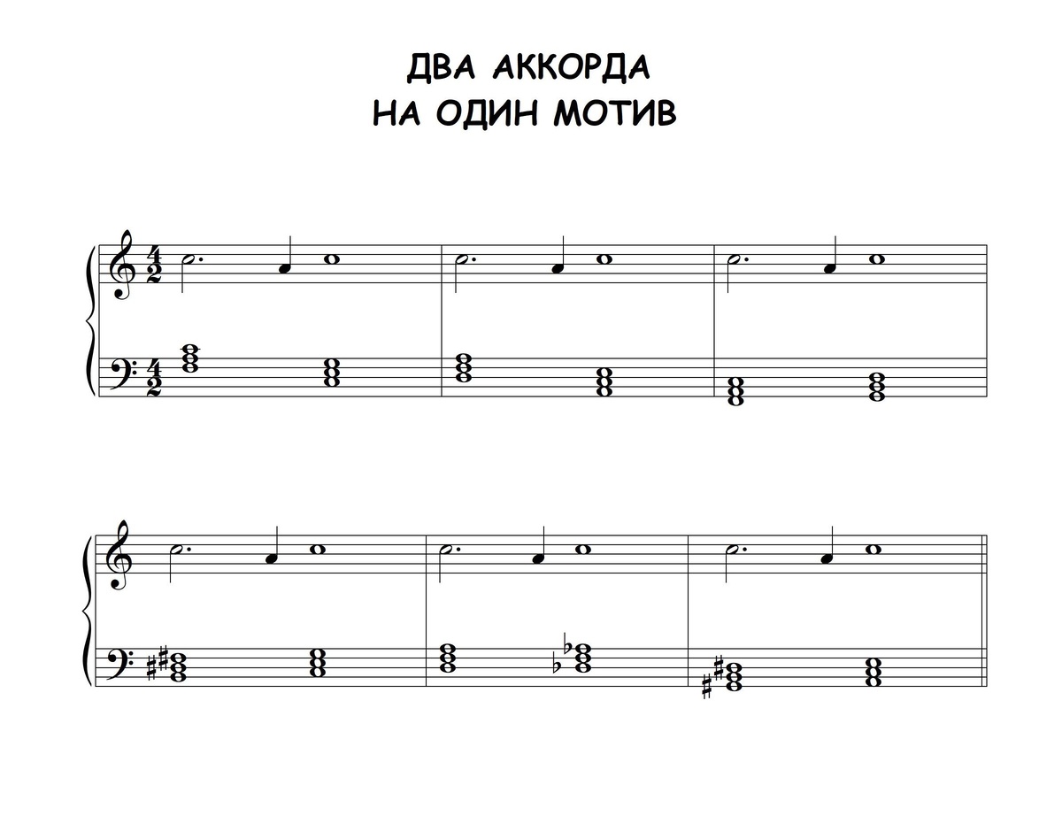 Предлагаем Вам упражнение на развитие гармонического слуха. 1) Берем один простой оборот – например, до-ля-до, как на картинке. 2) Берем два трезвучия на сильные доли, для начала можно ограничиться мажорными и минорными. Имеет значение только краска аккорда, поэтому трезвучие можно брать в элементарном виде, не думая о голосоведении. 3) Оцениваем свои ощущения от сочетания мелодии и аккордов. Для тех, кто хочет попрактиковать упражнение всерьёз, прилагаются все 24^24 = 576 вариантов аккордовых пар. Можно ограничиться характеристиками приятно +, неприятно –, нейтрально 0. Можно добавлять более тонкие нюансы и обозначить их первыми буквами прилагательных в таблице аккордов : с - странно, м - мягко, т - таинственно, р - резко и так далее. Мотив при желании можно изменить или заменить. Обращая фокус внимания на гармоническую краску, этим упражнением Вы активизируете свой гармонический слух.