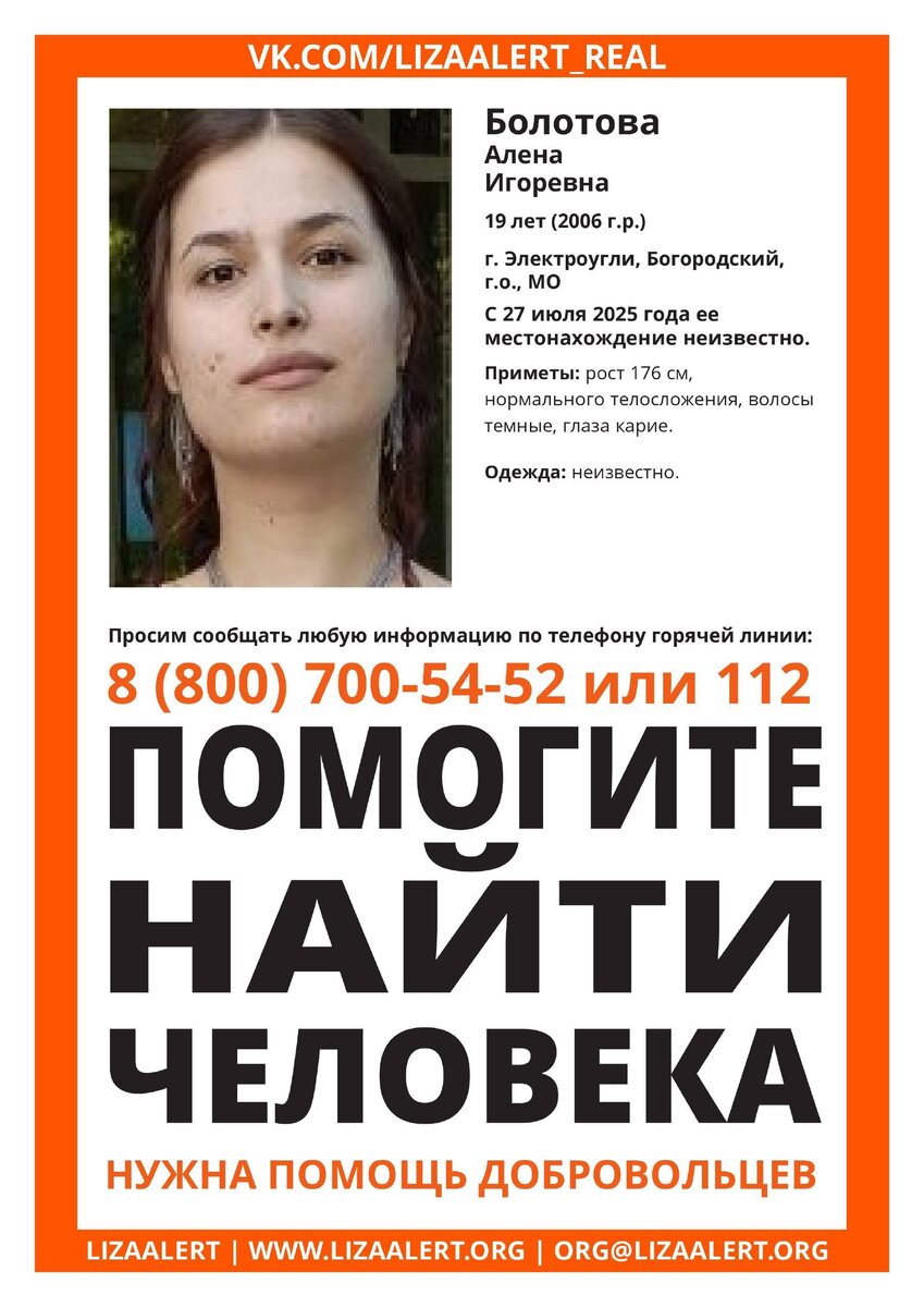 Пропала Болотова Алена Игоревна, 19 лет, Электроугли, Богородский г.о., Московская обл. С 27 июля 2025 года ее местонахождение неизвестно.