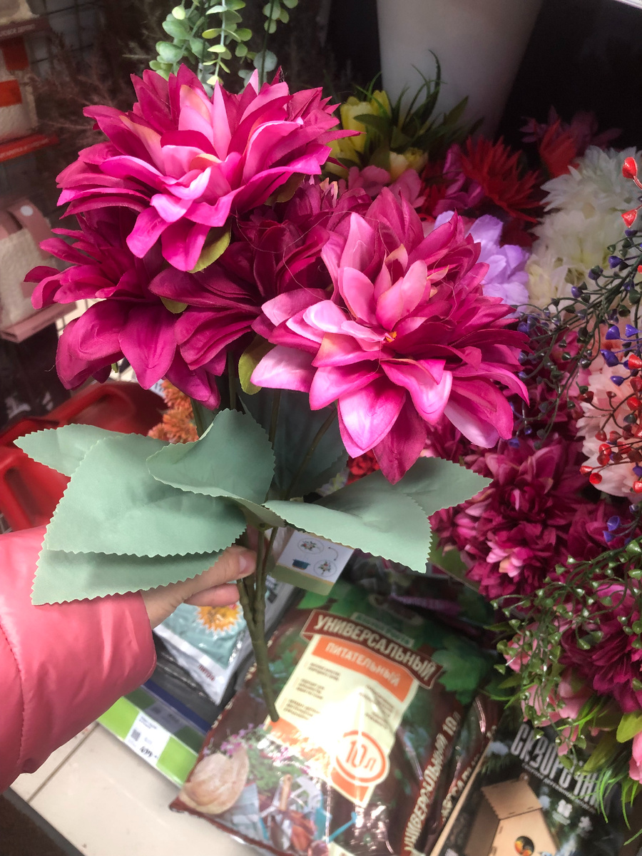 Начну с самого яркого уголочка магазина, отдел искусственных цветов и растений. В продаже появился новый искусственный цветок Георгин Гранд Бэй. Н одной ветке множество пышных цветов.