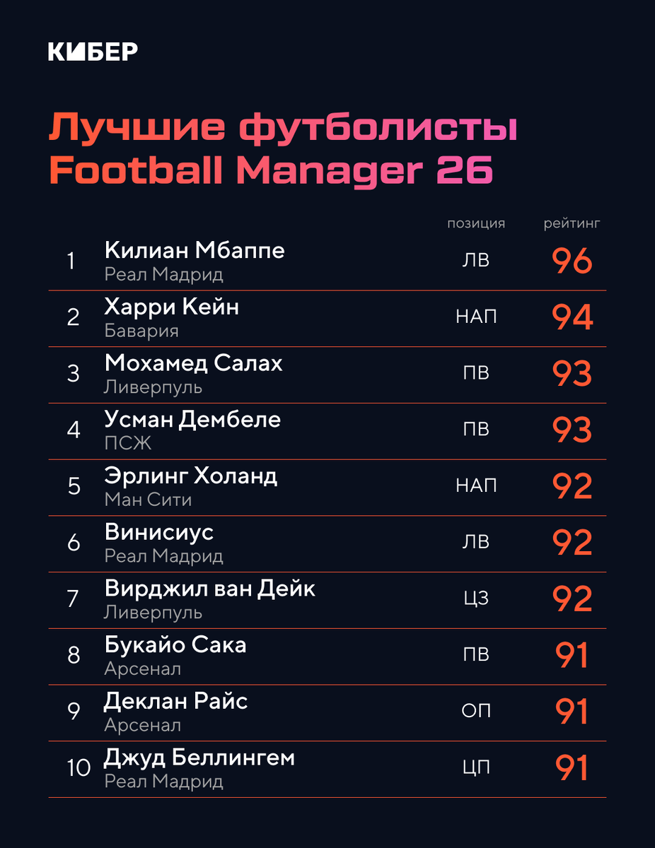 Усман только четвертый. FM26 стартовал с кучей багов, но все равно собрал 85 тысяч онлайна на релизе в Стиме. Sports Interactive выпустила уже несколько патчей, а игроки исследуют новый менеджер. Какие футболисты получили самые впечатляющие скиллы в игре? Давайте выясним! Рейтинги FM скрыты, поэтому мы использовали 100-балльную формулу фан-сайта FMInside. 📌 Подпишись на наш телеграм про игры и кино: новости, инсайды и розыгрыши уже там! Самый высокий рейтинг FM26 у нападающего мадридского «Реала» Килиана Мбаппе. У француза элитные показатели скорости (по 19 из 20), завершения и дриблинга (по 18), а еще солидные психологические данные. Английский форвард «Баварии» Харри Кейн с ударами 19 – второй. Крутые скиллы получили звездные вингеры Мохамед Салах и Усман Дембеле. Некоторым игрокам повезло меньше. Обладатель «Золотого мяча-2024» Родри оказался слабее Деклана Райса (90 против 91) и стал лишь 12-м. Бразилец Рафинья получил крупный апгрейд за рекорд в ЛЧ (до 88), но остался со скромным