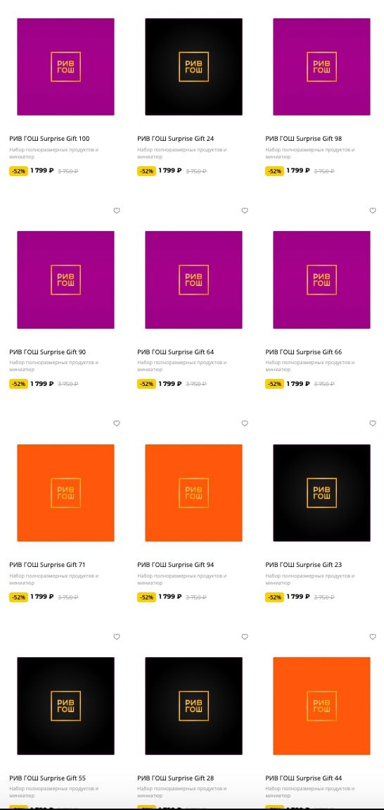 Божечки, сколько их🙈 Всё скринить не стала, их там очень много. Часть, кстати, уже раскуплена, не добавляется в корзину. Если возьмёте, присылайте потом сюда фоточки, интересно же😁😉 РИВ ГОШ Surprise Gift 🟠Стоимость 1799р Возможные варианты наполнения есть в описании к боксам!