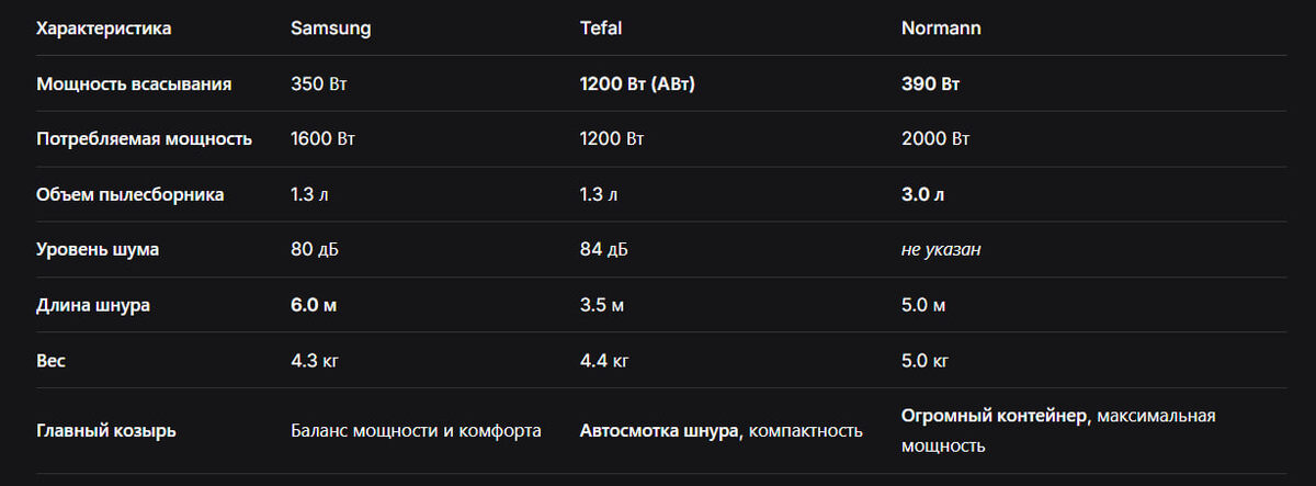 Всем привет! Выбор пылесоса — та еще головоломка. Хочется, чтобы и мощный был, и удобный, и шнур чтобы не путался, и пылесборник опорожнять раз в полгода. Сегодня устроим дуэль трех популярных моделей: Samsung, Tefal и Normann. Сразу скажу — явного аутсайдера здесь нет, у каждого свои козыри. Смотрите, кто вам больше по душе. Для наглядности — сводная таблица по ключевым параметрам: Тут все не так просто. Цифры потребляемой мощности (1600, 1200, 2000 Вт) — это не про силу уборки, а про аппетиты прибора. Настоящая сила — в мощности всасывания (измеряется в АэроВаттах, АВт). Победитель раунда: Tefal, если верить цифрам. Норманн и Samsung — на уверенном втором месте. Как часто вы готовы вытряхивать пылесборник? Здесь разворачивается главная битва комфорта. Победитель раунда: Tefal с большим отрывом.