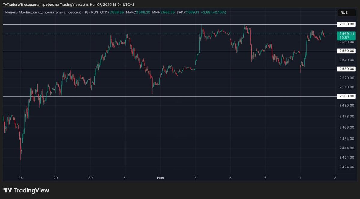 🧠 ЧТО ПО ЧЕМ? 👉 В итоге, весь рост, что получился по индексу сегодня НЕ слили. Оно и хорошо, так как поэтому сформировалось лонговое закрытие с поджатием под сопротивление 2580, которое скорее всего в ближайшее время будет пробито вверх. Жду движения по индексу в сторону 2600 - 2650, а там дальше будем смотреть по факту. ❗️ Однако важно понимать следующее. Так как индекс дал аномальный рост за сегодня есть большая вероятность того, что цена просто технически пойдет и проторгует этот вынос. Поэтому в понедельник лучше всего смотреть лонги, но лонг не просто так, а именно на коррекции, от уровня 2550. Все более подробно буду писать в понедельник. Всем очень хороших выходных! 🤝