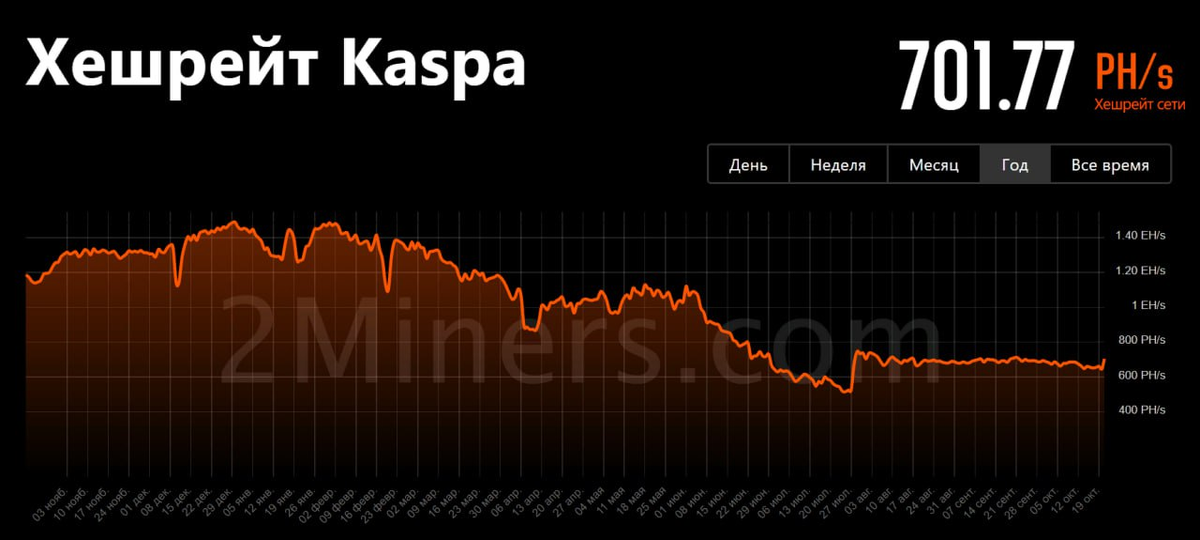 В конце октября хешрейт Kaspa превысил 700 Ph/s, благодаря подключению новых майнеров.