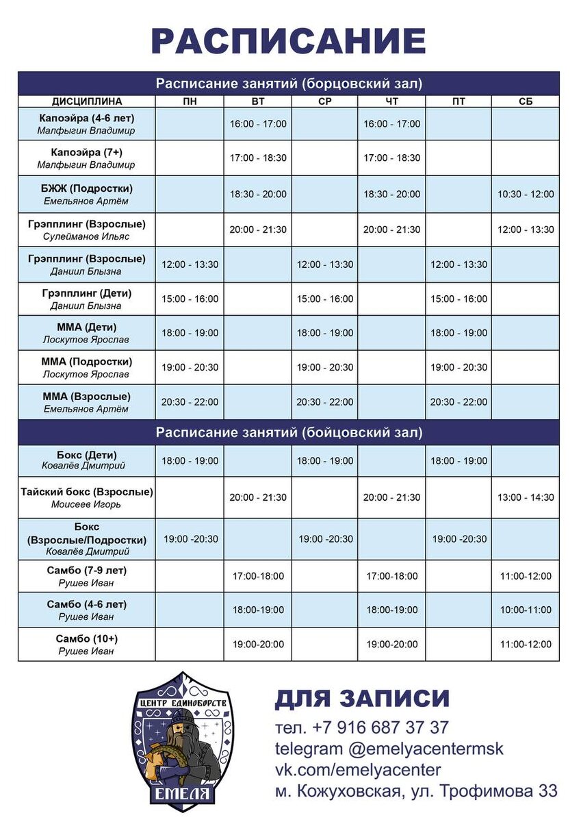РАСПИСАНИЕ ТРЕНИРОВОК ПО ВСЕМ ДИСЦИПЛИНАМ Запишись на пробное занятие через администратора @emelyacenter или по номеру телефона 👇 ___________________________________ 📍 Москва, м. КОЖУХОВСКАЯ, ул. Трофимова 33. 📞 +7 916 687 37 37 🌐 емеляцентр.рф