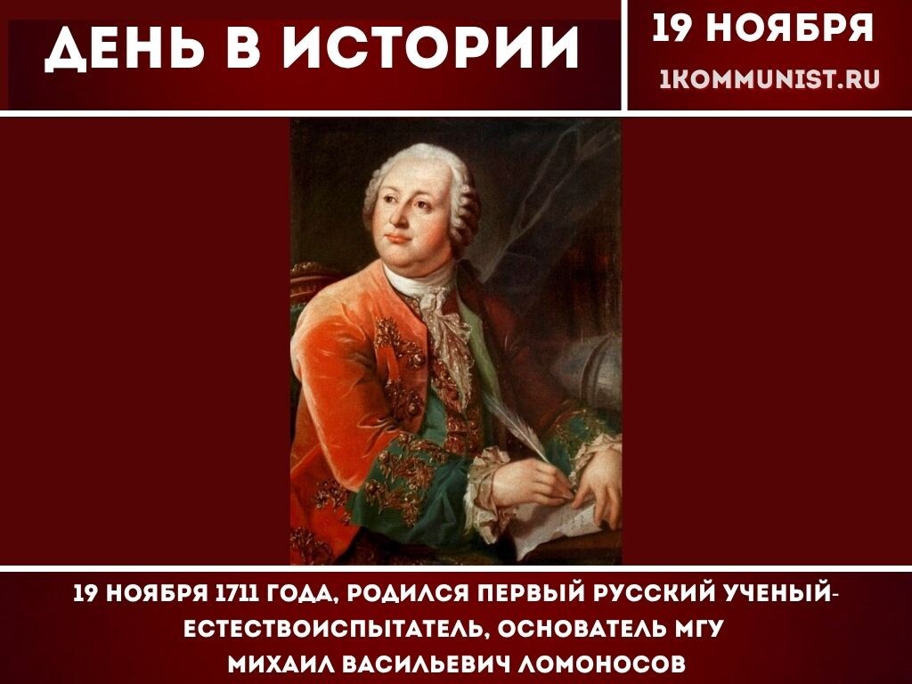 19 ноября 1711 года, родился первый русский ученый-естествоиспытатель, основатель МГУ Михаил Васильевич Ломоносов