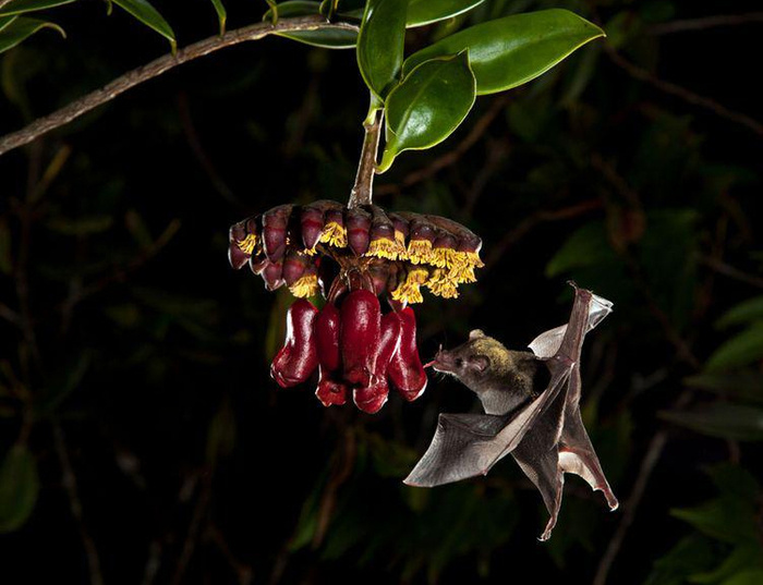 Сегодня снова хочу поведать вам про удивительную дружбу растений и животных. Герои этого рассказа – кубинская лиана макгравия эвения и местная летучая мышь по имени листонос Лича из рода однолистых листоносов. Однолистые листоносы – это махонькие летучие мышки, длиной тела не превышающие 8 см, а обычно и того меньше. Ведут они типичный летучемышиный образ жизни, днём отсыпаясь во мраке пещер, а ночью выбираясь на сбор провианта. В плане подбора меню они совершенно не вредничают, с удовольствием уплетая сочные плоды, цветочный нектар, а иногда и насекомых. Но макгравия «хочет», чтобы листоносы употребляли именно её нектар, ведь эти мышки – великолепные опылители – одни из лучших, что есть на Кубе. А в природе оно же как? Хочешь преимуществ – умей вертеться. Вот и пришлось макгравии учиться вертеться, а точнее разработать приспособление, позволяющее «позвать» листоносиков на поздний ужин именно к своему столу. Если мы внимательно рассмотрим побег макгравии, то, кроме яркого соцветия удив