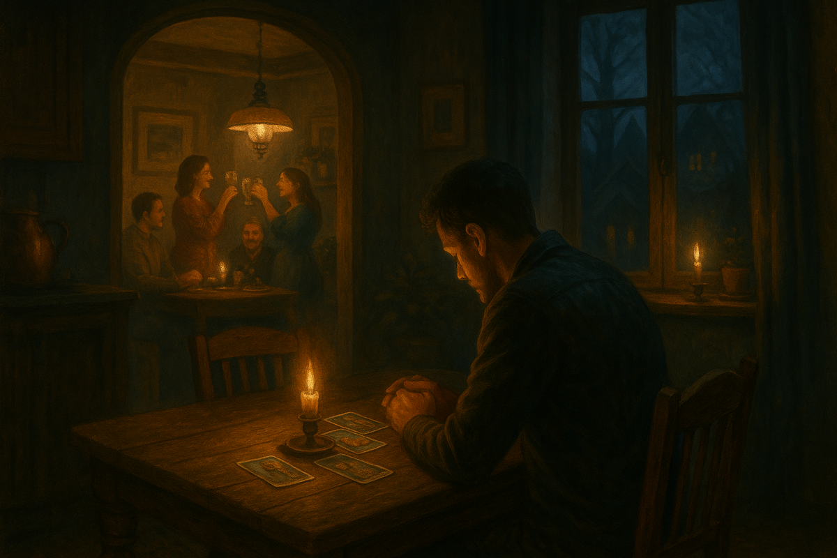 Дома у него сейчас ощущение, будто живут не близкие, а посторонние люди. Каждый сам по себе: могут сидеть в одной комнате, но между ними тянется холодная пауза. Разговоры — по делу: кто что купил, кто за кем заехал, кто заплатил за счета. О чувствах, поддержке, мечтах — почти не говорят. Там, где раньше было «мы», сейчас — вежливое, но отдалённое «ты» и «я». Внутри он всё равно ищет точку опоры и думает, стоит ли пытаться вернуть душевную близость или уже планировать свою собственную дорогу. Он как человек, который стоит у закрытой двери: одной рукой ещё держится за привычный дом, другой уже тянется к новому, неизвестному. Он часто прокручивает прошлое, сравнивает, каким всё было раньше и во что превратилось сейчас, и понимает, что часть решений уже не откатить назад. В воздухе чувствуется усталость и скрытое напряжение. Есть привязанности, от которых трудно отказаться: общие дела, обязательства, материальные вопросы, возможно — страх одиночества. Это держит всех под одной крышей, но н