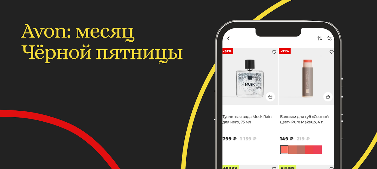 В рамках акции «Чёрная пятница» на протяжении всего ноября покупателей Avon ждут скидки до 60% и ряд предложений на популярные продукты. Они уже доступны на сайте в тематическом разделе. Всего три вида предложений: акции, хиты и скидки. Давайте разберёмся, что скрывается за каждым из них! Акции Это спеццены на продукты при покупке от 2-х штук. Глиняная маска для лица «Питание и восстановление» Маска с аргановым маслом напитает и восстановит кожу, сузит поры и сделает её гладкой и свежей. Пена для ванн «Истинная роскошь» Порадуйте себя и любимых ароматизированной пеной с нежным персиком и ванильной орхидеей. 2 в 1 Шампунь-кондиционер для волос «Интенсивное питание» Шампунь с маслами авокадо и миндаля насыщает волосы по всей длине, возвращает шелковистость и гладкость. Подходит даже для сухих и вьющихся волос. Хиты Скидки на самые популярные продукты. Today для нее Изысканный аромат для утончённых девушек с акцентами гибискуса и ваточника сирийского, нежным сердцем из лепестков нероли и