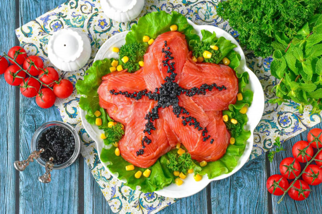 Салат "Морская звезда" — это яркое и витаминное блюдо, которое идеально подходит для праздничного стола. Красная рыба придаёт салату насыщенный вкус и изысканный аромат. Вот рецепт: