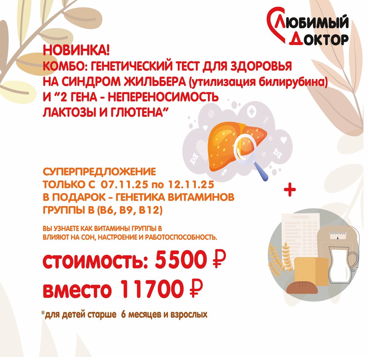 Уже ноябрь и осенняя хандра постепенно появляется почти у каждого, но возможно, дело не в сезоне, а в особенностях организма? Как вы уже знаете, в нашем медцентре есть такая возможность - приобрести генетические тесты, которые помогут вам узнать, как Ваш организм влияет на те или иные условия. Тем более, что в этом месяце у нас новинка!!! Комбо : три генетических теста в одном предложении: 🔥тест на «Синдром Жильбера», поможет узнать, как ваш организм перерабатывает билирубин. 🔥 тест на «Непереносимость лактозы и глютена» даст ответ, почему хлеб и молоко вызывают дискомфорт. 🔥А ЕЩЕ В ПОДАРОК 🎁 - генетический тест на группу Витамина B: откроет секрет правильного восстановления энергии, сна и настроения. ‼️ ТОЛЬКО ДО 12 ноября цена тестов плюс ПОДАРОК — всего за 5500 руб. вместо 11700 руб. Поддержите своё здоровье!