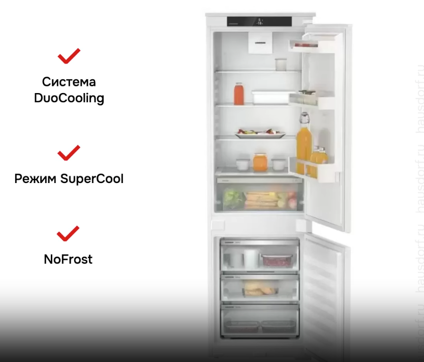 Если нужен надёжный встраиваемый холодильник, который не только впишется в кухню, но и обеспечит стабильное хранение продуктов, Liebherr ICNSf 5103 Pure заслуживает внимания. Это современная двухкамерная модель с системой No Frost, точным управлением и характерной для бренда аккуратной сборкой. Холодильник встраивается полностью, оставаясь незаметным за фасадом мебели. Высота модели — 177 см, что позволяет совместить её с большинством стандартных кухонных гарнитуров. Несмотря на компактный внешний формат, общий полезный объём — 253 литра: 183 л в холодильной камере и 70 л в морозильной. Внутренняя организация сделана по фирменному принципу Liebherr — всё просто, но логично. Полки из закалённого стекла регулируются по высоте, дверные балконы подстраиваются под высокие бутылки и небольшие банки, а прозрачные ящики помогают сразу видеть содержимое. В нижней части холодильного отделения расположена зона EasyFresh — герметичный контейнер для овощей, фруктов и зелени. Благодаря плотному упло