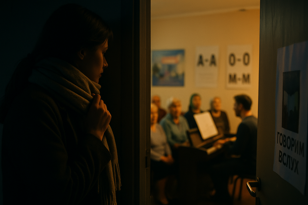 Я шла медленно, чтобы не наступить на своё достоинство. Коридор пах краской и детским рисунком: на стенах — коты, подсолнухи, огромный оранжевый смайл в углу. Через закрытую дверь пробивался голос — мужской, рукастый: «Раз-два, не спешим, дышим». И ещё — другое: гул песен, которые все знают, даже если не любили: «Смуглянка», «Катюша», «Подмосковные вечера». Но между песнями — тишина, аккуратная, как сложенное бельё.