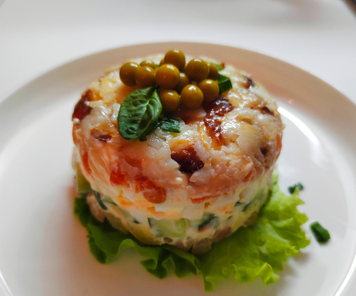 Почти "Оливье", но не совсем. Главное отличие конечно же в том, что это рыбный салат. И копчёная рыба, как оказалось, прекрасно сочетается со всеми традиционными ингредиентами любимого русского салата: Поскольку все мы, без исключения, прекрасно умеем готовить "Оливье", решила не расписывать процесс подробно. - рыба горячего копчения 400 г - яйца 4 шт. - картошка 3 шт. небольших - морковь 1 шт. средняя - свежий или маринованный огурец 2 шт. небольших - майонез - для украшения: зелёный лук, зелёный горошек, листовой салат Картошку и морковь желательно завернуть в фольгу и запечь в духовке при 200 градусах до мягкости (+-30 минут). Но можно сварить как обычно на салат или воспользоваться быстрым способом, который я описала здесь: Из рыбы (у меня палтус) тщательно выбираем кости. Подготовленные продукты нарезаем мелкими кубиками. - картошка; - огурец; - яйца; - морковь; - рыба; ☝️Пользуемся секретом опытных шеф-поваров: если в блюде есть деликатесный продукт, его должно быть видно