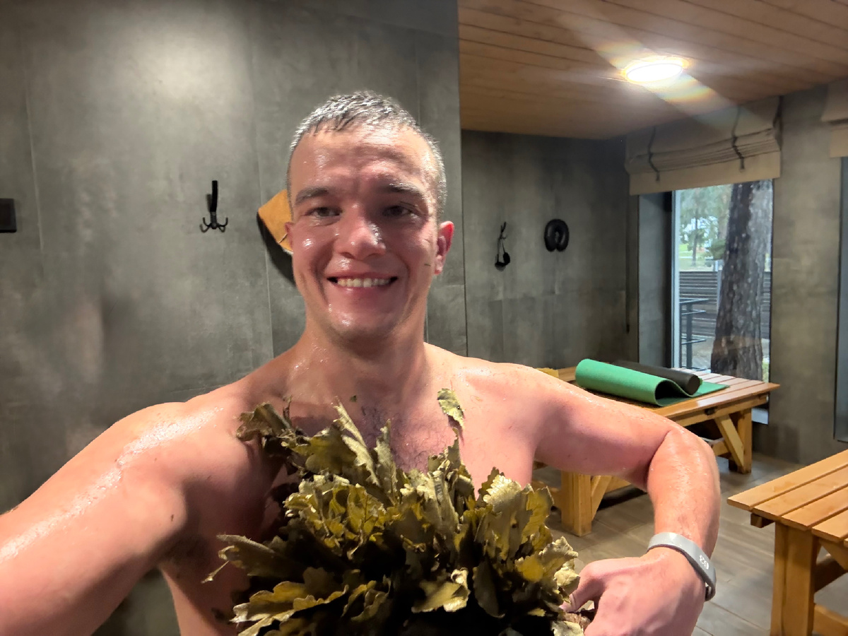Лёг на спину. Под голову — холодный веник, на лицо — тоже холодный веник для дыхания и свежести. Денис начал поддавать пар, и вскоре парная наполнилась густым жаром. Он методично прошёлся по всей передней части тела, создавая волнами жар, который пробирает до самых костей. Ощущения сильные, но приятные — тело будто просыпается изнутри. На этом первая часть завершилась.