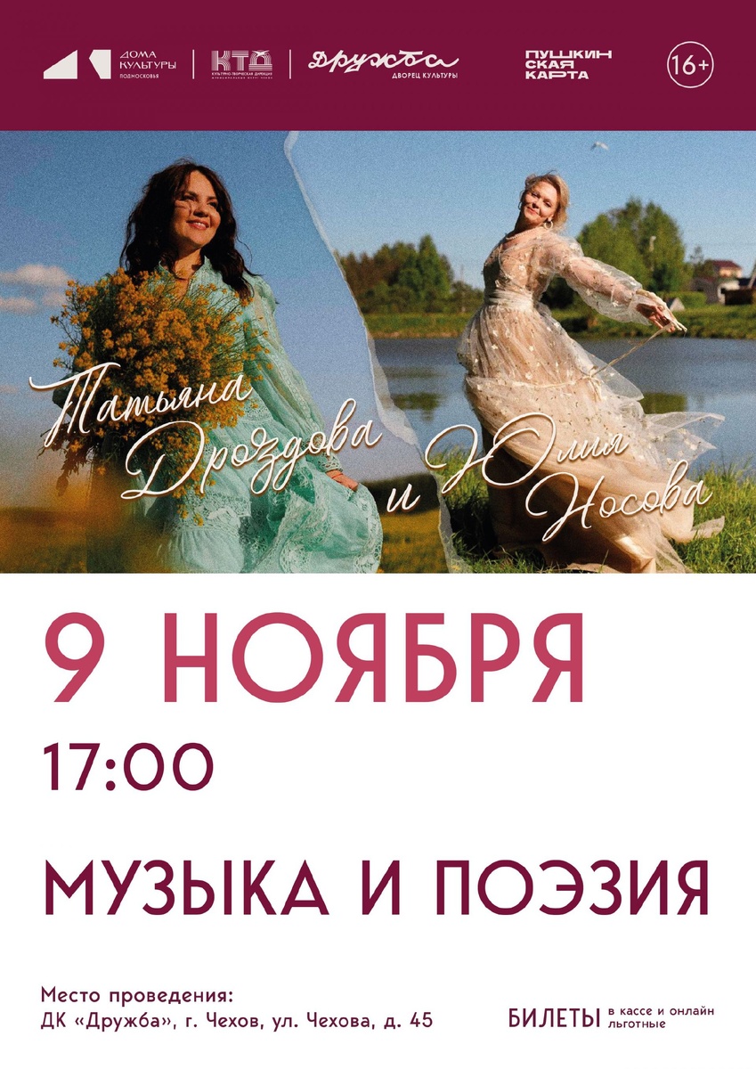 ✨ Концерты во Дворце культуры "Дружба" В НОЯБРЕ Выбирайте мероприятие по душе, покупайте билеты в кассе ДК и отправляйте подпевать и танцевать 🔥 P. s. На концерт Татьяны Булановой все билеты распроданы. 🏢 ДК «Дружба» 📍 г. Чехов, ул. Чехова, д.45 ⭐Поддержать канал голосом ✅ Мероприятия Чехов https://dzen.ru/id/66cc4b48e9ef144699238a51 http://vk.com/chekhov_events http://dzen.ru/chekhov_events