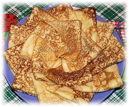 Один из самых любимых рецептов блинов в моей семье. - 4 яйца - 1ст.л. сахара - 1ч.л. соли - 700-800мл. молока (можно молоко+вода 50/50) - 2ст.л. растительного масла - 8-9ст.л. с максимально большой горкой муки В миске смешать яйца, сахар, соль и 200мл. тёплого молока. Затем всыпать муку и быстро размешать до полного исчезновения комочков (мешать вручную, венчиком). Влить растительное масло, размешать, чтобы оно разошлось в тесте и только после этого влить оставшееся молоко (тёплое). Тесто получается жидкое, то есть из него можно выпекать очень тонкие, почти прозрачные блинчики, а если налить побольше теста на сковороду, то и блины получатся обычной толщины. Регулировать толщину блинов очень удобно - чем жиже тесто, тем тоньше блинчики. Поэтому, если хочется совсем тонких и прозрачных блинов, то можно добавить немного жидкости (молока/воды) и наливать на сковороду ровно столько теста, чтобы только-только покрыть поверхность сковородки. Сковороду хорошо разогреть, смазать маслом только п