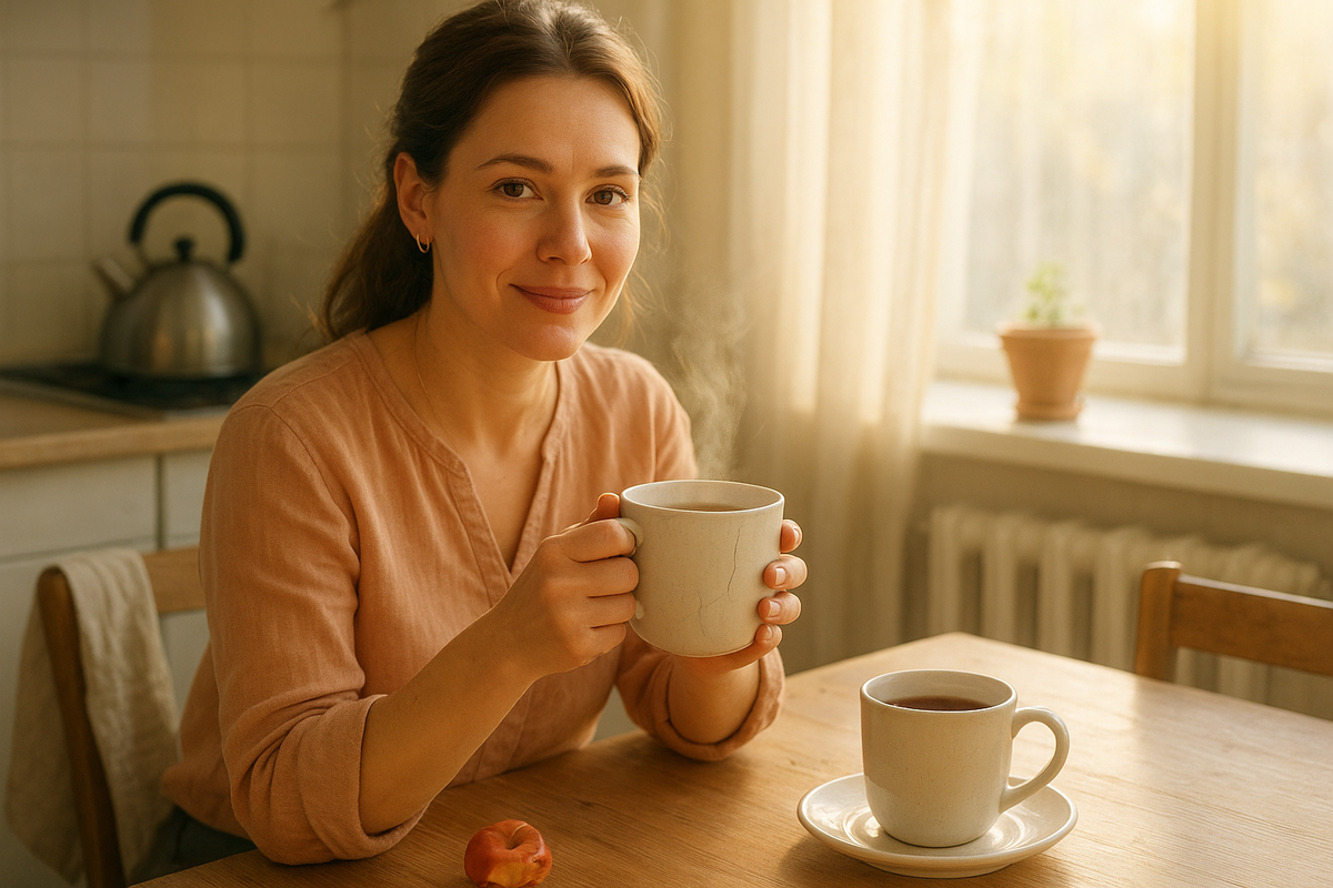 Утро снова приходит прохладой окна, ленивым солнцем на плитке и свистом чайника — как стартовый пистолет, не тревога. Я наливаю в «его» кружку — теперь в свою — и держу обеими руками. Пар касается ресниц. В этом касании — обещание, не долг. Я делаю глоток и чувствую: кое‑что разбилось давно.