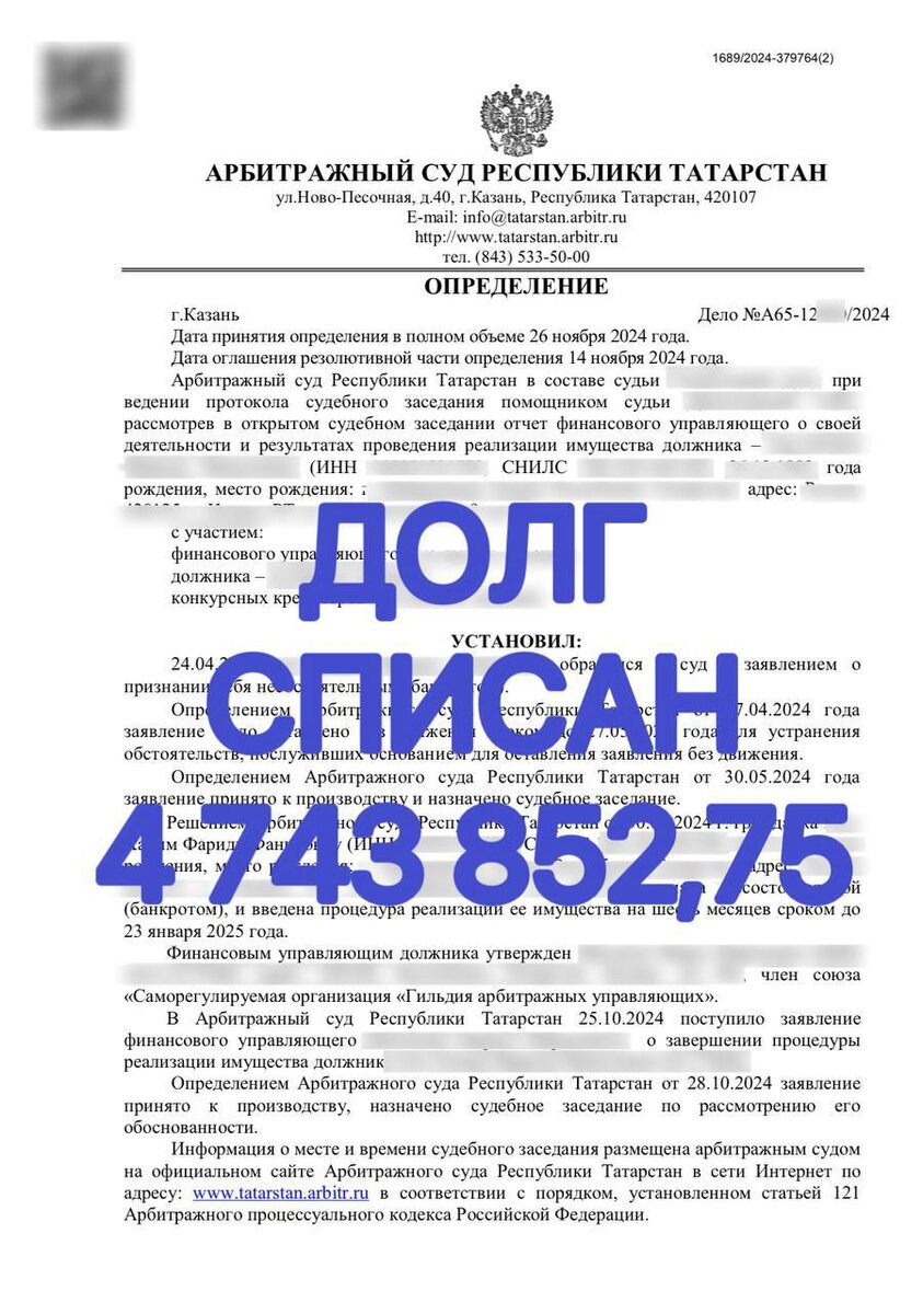 ❤️5 детей, 5 миллионов долгов — и одно решение!☘️ Жительница Казани, 38-летняя Арина Л., мать пятерых детей 👩👧👦, столкнулась с тяжелой финансовой ситуацией после развода и потери стабильного дохода. 💫 Несколько лет назад, пытаясь обеспечить семью, она взяла несколько кредитов в банках и микрофинансовых организациях 🏦. Сумма задолженности росла из-за процентов и штрафов, пока не достигла почти 5 миллионов рублей 📍. Арина пыталась выполнять обязательства: подрабатывала, оформляла пособия, но дохода всё равно не хватало даже на базовые нужды — еду, одежду и оплату ЖКХ 🥺. ⚔️В результате женщина оказалась в долговой ловушке: коллекторы звонили ей ежедневно ☎️, начались аресты счетов и имущества. В 2024 году Анна обратилась за юридической помощью ⚖️ и узнала о возможности банкротства физического лица. Благодаря поддержке юристов, был собран необходимый пакет документов, подтверждающий её неплатежеспособность: ✅минимальные доходы, ✅отсутствие ликвидного имущества и наличие ижди