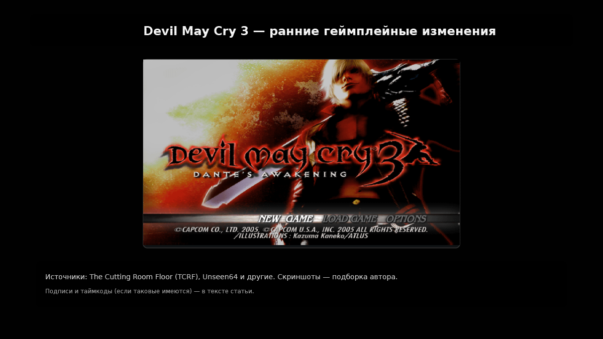 До релиза Devil May Cry 3 проходил через заметные трансформации: другие анимации, HUD, поведение врагов и элементы управления — часть того, что мы видели на E3 и в ранних прототипах, потом была изменена. Разбираем самые интересные отличия и объясняем, почему они могли исчезнуть из финала. Devil May Cry 3 — одна из самых обсуждаемых частей серии: игра сочетала агрессивный темп, сложные комбо и стильный визуал. Но перед выходом проект проходил через несколько заметных итераций: на выставочных демонстрациях и в прототипах видно, что разработчики меняли баланс движения, интерфейс и даже поведение некоторых врагов. Эти находки хорошо задокументированы на архивах и в видеоархивах. На выставках (E3 2004 и ранние промо-демо) показывали сборки с отличиями в HUD, физических эффектов плаща и некоторых анимациях удара и уклонения; эти ролики и записи — первичный источник, позволяющий сравнить билд до полировки с финалом. В свободно доступных видео видны иначе настроенные dodge/evade движения и