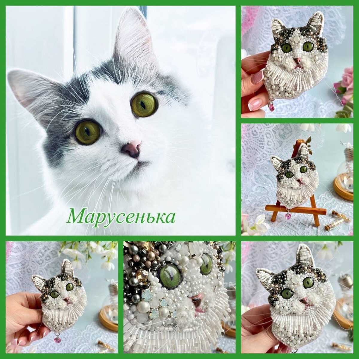 🐈Брошь «Мурчащий ангел». Кошечка Марусенька. Эта брошь создавалась с особой любовью, чтобы запечатлеть уникальные черты любимицы. Я старалсь передать именно ее внимательный взгляд больших глаз, пятнистый носик. Такой аксессуар — это самый душевный способ всегда носить с собой частичку своего пушистого друга. Брошь выполнена качественно и с вниманием к деталям, чтобы радовать долгие годы. Такую брошь можно заказать в подарок: · Для себя, если вы хотите сохранить память о питомце в изящном украшении. · Для человека, который ищет уникальный и персонализированный подарок. · Для всех, кто ценит ручную работу и индивидуальность. 📍Материал: элементы Swarovski, элементы Preciosa, стойкий японский бисер, рубка, рондели, майорка, замша. 📍Размер: 10,5 на 7,5 см 📍Особенности: две застежки - японская булавка с поворотным механизмом и булавка-бабочка - надежно фиксируются на одежде. 🪙Стоимость 7500₽ и доставка. В наличии нет, выполнена на заказ. #oksana_brooshi #брошькошка #брошьпофото