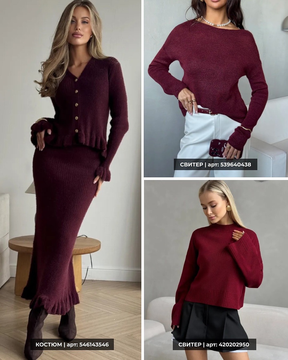 - винный костюм артикул 546143546 и два свитера артикул 539640438 и 420202950 позволяют строить образы разной степени нарядности в бордовой гамме;
