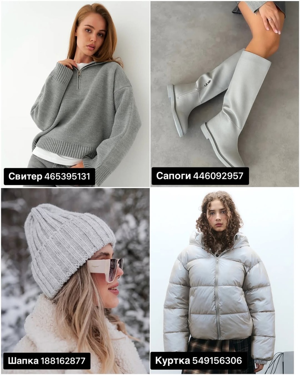 - тёплая коричневая группа (два вида сапог, пуховик какао и серый удлинённый) добавляет глубины и вариативности.