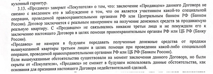 Когда я писал серию постов про развороты сделок с квартирами, завалили однотипными вопросами, на которые я устал отвечать: А если в договоре прописать/взять расписку/сделать запись на камеру, что продавец не участвует в какой-либо специальной операции ФСБ/ЦРУ/МИ6? Тогда же сделку не развернут? Собственно, вот и ответ на этот вопрос. В исходном посте в ВК приведена копия пункта договора: Т.е. сделку все равно развернут. ЗЫ: не скрою, у самого уже появляется подозрение, что настоящие мошенники - именно продавцы, которые жаждут наживы таким образом. Лет 15-20 назад, рассказывал про это на Пикабу в ранних постах, была волна, когда квартиру продавали те, кто - состоит на учете в психушке - состоит на учете в наркологии а потом бежали в суд, разворачивать сделку, не осознавал, что творю, вот справка из ПНД/был под веществами, вот справка из наркологии. Собственно, именно с тех пор закрепился обычай - требовать у продавца справки, что не состоит на учете. Ясен пень, денег у них, чтобы вернуть