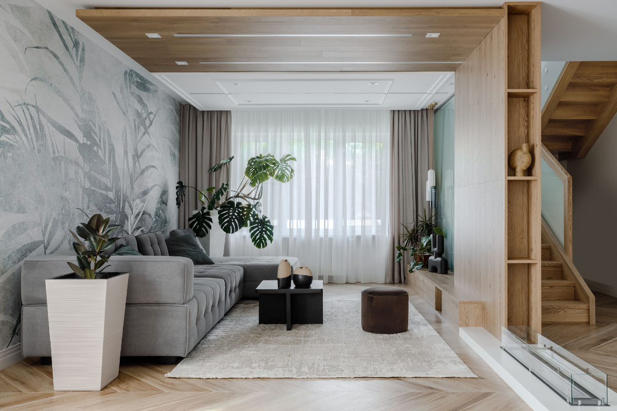 Проект реализован для дома площадью 160 м2, расположенного в г. Шахты. Мы проектировали не только интерьеры дома, но и ландшафтный дизайн, новый навес для машин, мастерскую и террасу при кухне. Для некоторых помещений второго этажа добавили мансардные окна. Визуализацию проекта можно посмотреть здесь. Дом двухэтажный. На первом этаже расположена кухня, гостиная, котельная, санузел и гостевая комната. Когда на обмерах мы увидели, что окно кухни выходит в сад, то сразу решили, что нужно сделать из него витраж в пол, чтобы дать в кухню больше света и открыть вид на участок. Кухня отделена от гостиной несущей стеной, потому объединять их мы не стали. Зато создали рядом с входом второй проем, в котором разместили полки с цветами и декором. Таким образом, кухня и гостиная стали более связаны визуально, а из гостиной стало видно сад. Кухня решена двумя параллельными линиями: пеналы с бытовой техникой и большой остров. Вытяжка встроена в столешницу, что тоже даёт больше пространства. Пропорци