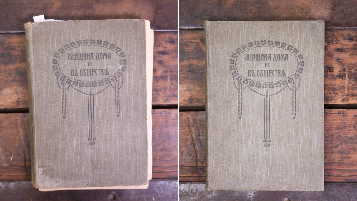Реставраторам предстояло вернуть книге прочность, не нарушая её исторический характер. Мы бережно очистили ткань переплёта, укрепили корешок и внутренние соединения, сохранив тем самым родной материал и тиснение.