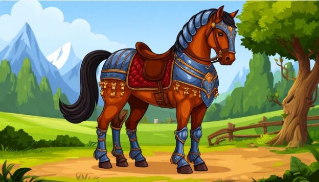 Боевой конь, верный товарищ рыцаря, теперь тоже почти полностью был скрыт броней. Чтобы нести ее на себе, да еще и столь же тяжело вооруженного всадника, от коня требовались, конечно, особая сила и выносливость. Наголовник или налобник для скакуна обычно выковывался из цельного листа металла и закрывала ему лоб. В нем были большие отверстия для глаз с выпуклыми краями, закрытые железными решетками. Шею коня закрывал нашейник. Он составлялся из поперечных чешуек-полосок и больше всего напоминал… хвост рака. Такой доспех полностью закрывал гриву и прикреплялся к налобнику с помощью металлической задвижки. Был предусмотрен и специальный нагрудник. Составленный из нескольких широких поперечных полос, он смыкался с нашейником и кроме груди защищал верхнюю часть передних ног. Бока коня прикрывали два цельных стальных листа, тесно смыкавшихся нагрудником. Боковые части доспеха тесно смыкались с нагрудником. Сзади конь тоже защищался от возможных ударов очень широкой и выпуклой броней, выкова