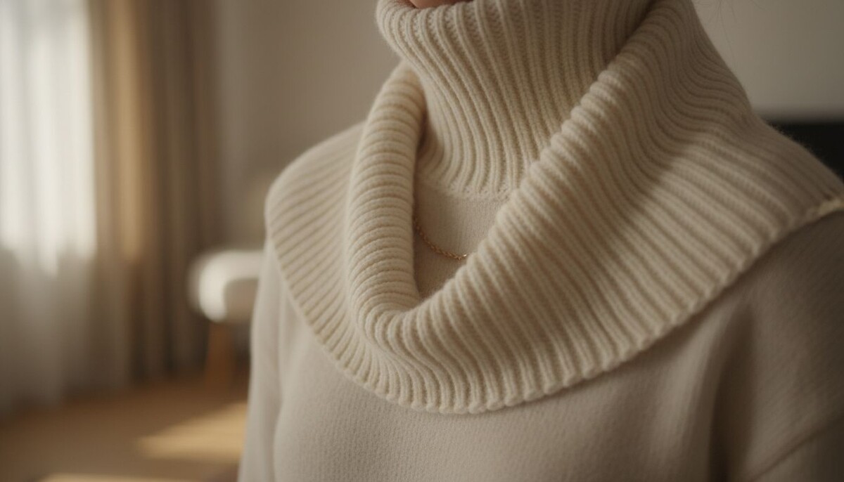 - Под Костюм: Выбирайте тонкие, но плотные водолазки-стойки в нейтральных тонах (черный, серый, экрю). Носите их под брючный костюм с ультра-широкими шерстяными брюками. Это сразу считывается как высокий уровень стиля.