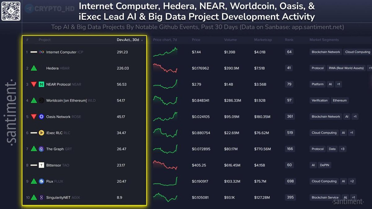 #ончейн #рейтинг #ai 📊 Santiment: ТОП-10 криптопроектов в сферах AI и Big Data по активности разработчиков: 1. Internet Computer #ICP 2. Hedera #HBAR 3. NEAR Protocol #NEAR 4. Worldcoin (на Ethereum) #WLD 5. Oasis Network #ROSE 6. iExec RLC #RLC 7. The Graph #GRT 8. Bittensor #TAO 9. Flux #FLUX 10. SingularityNET #AGIX Ранее: прошлый топ Crypto Headlines