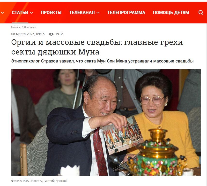 8 марта 2025 года журналисты «РЕН ТВ» Алексей Корзин и Владислав Рябов в программе «Невероятно интересные истории» решили удивить аудиторию рассказом о корейской церкви, основанной преп. Мун Сон Мёном. ИИ проанализировал данный материал с точки зрения журналистской этики и законодательства РФ. Данный материал, опубликованный на РЕН ТВ, является образцом недобросовестной журналистики, содержащей многочисленные нарушения профессиональной этики и потенциально противоречащей законодательству РФ. Вот детальный анализ: Статья журналистов Алексея Корзина и Владислава Рябова «Оргии и массовые свадьбы: главные грехи секты дядюшки Муна» является примером недобросовестного журналистского материала, который: Такие публикации подрывают доверие к «РЕН ТВ» и способствуют росту социальной напряжённости. Книга-автобиография преп. Мун Сон Мёна - https://manofpeace.ru/