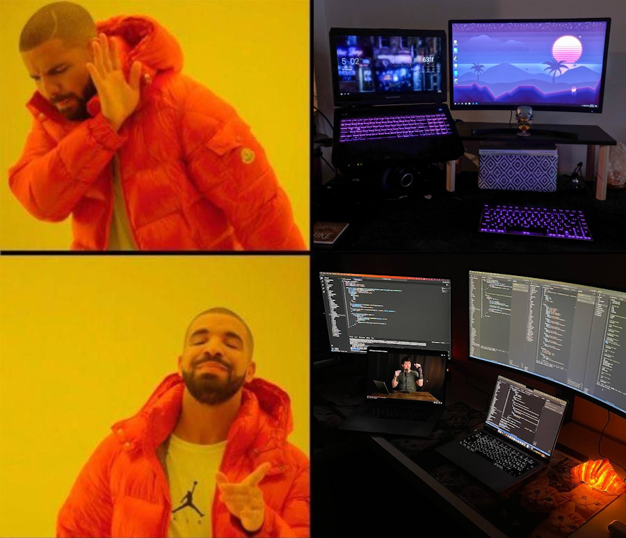 Однажды в одном из блогов встретил фотографию из прикреплённого мема с двумя рабочими ноутбуками. Сначала ехидно улыбнулся. Но потом всё осознал. Всё чаще оперируя AI-агентами, действительно всё меньше требуется каких-то ручных непрерывных манипуляций. И как-будто можно даже распараллелить работу над несколькими задачами или несколькими проектами. Когда проекты разные, проблем меньше всего. Минус буквально один: приходится делить ресурсы одной машины. Если проекты тяжёлые, то это критично. Особенно, когда речь про игры. Когда проект один, то придётся или держать несколько копий одного репозитория, или использовать git worktree (habr). Потому что делать несколько задач в одном проекте — это и риск перекрёстных изменений, и сложность формирования коммитов. А несколько копий — это снова конкуренция за ресурсы. Наличие нескольких рабочих станций эту проблему как раз решает. Но создаёт другую — необходимо достаточных размеров рабочее место. Моя текущая основная ОС — это Windows. И я был при