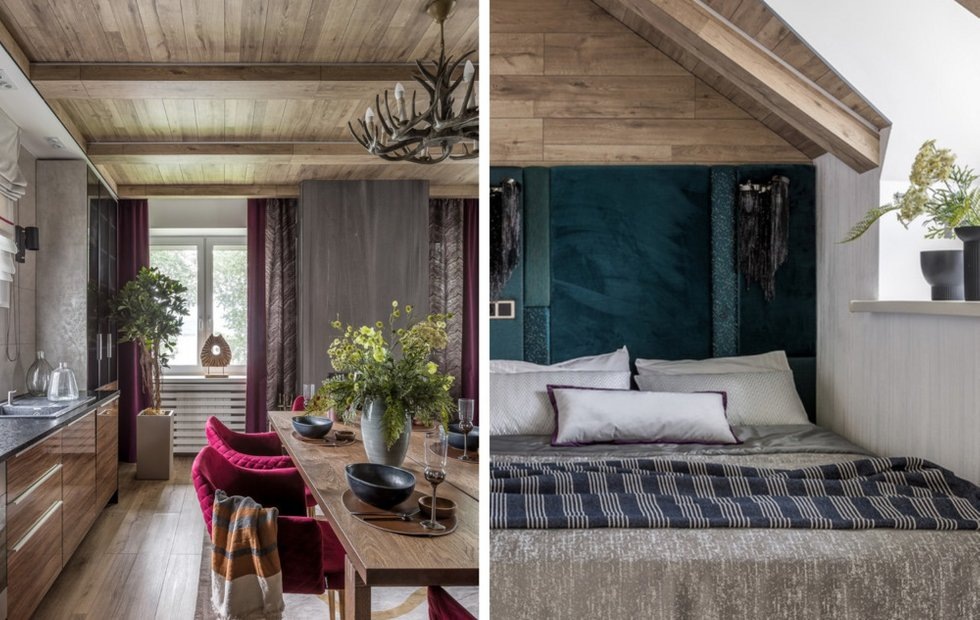 Заказчики приобрели этот небольшой дачный дом, чтобы скрываться в нем от городской суеты и принимать гостей. В нем можно было жить, но хозяев смущал устаревший ремонт, поэтому они пригласили дизайнеров, чтобы обновить интерьер. В результате здесь появились красивые потолки с балками, мебель, сделанная на заказ, и уютный текстиль.