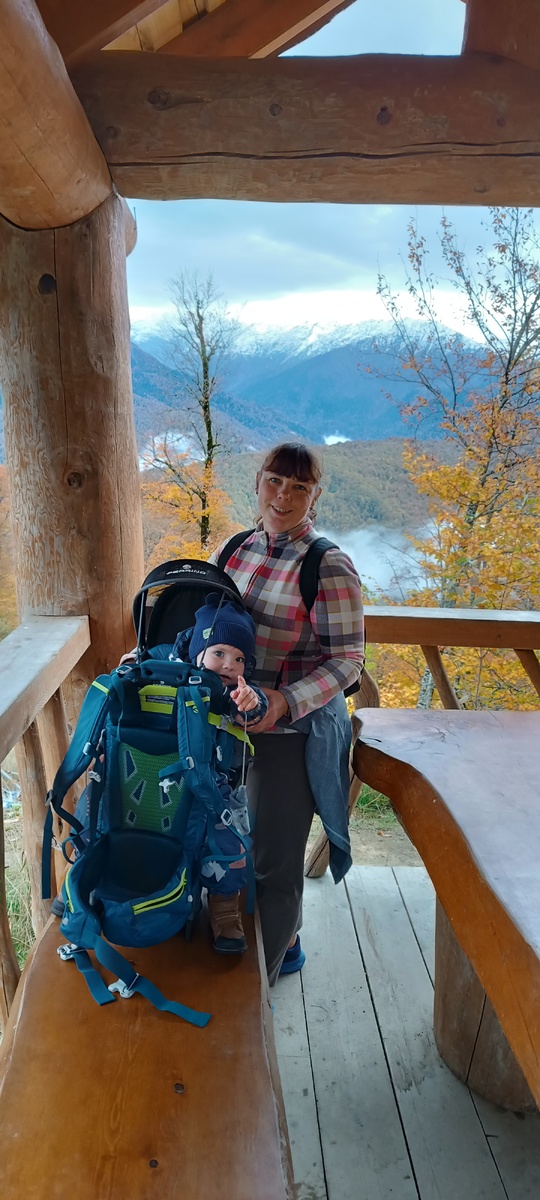 Четвёртый день. Озерный Траверс. Утро четвертого дня встретило нас дождем. Пока мы завтракали в уютном номере, увлеченные игрой с Никитой в его любимые наклейки, стихия решила немного угомониться. Небо смилостивилось, и мы отправились по живописному маршруту к озерам. Дорога тут асфальтированная – настоящее спасение для дождливой погоды! Мы смело посадили нашего маленького исследователя Никиту в рюкзак, вооружились зонтом и двинулись в путь. Маршрут петлял сквозь осенний лес, каждый поворот открывал все более захватывающие виды: золотые и багряные деревья, туман, стелющийся над землей, словно сказочный покров. Никита, наслаждаясь убаюкивающим покачиванием, тут же погрузился в сладкий сон. У первого озера (кстати, искусственного, но от этого не менее живописного!) пришло время обеда. Наш выбор пал на очаровательное мини-кафе "Шишкин двор". Мы заказали ароматные хачапури. Никита, хоть и не отличался большим аппетитом в тот день, с удовольствием перекусил нашим угощением. Обратная