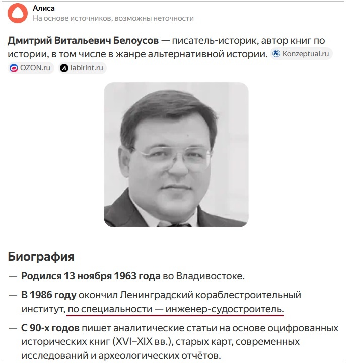 Очень многие альтернативщики просто повторяют байки одного из «основоположников» нападок на «официальную» историю – Д. Белоусова, приписывая ему звание историка.