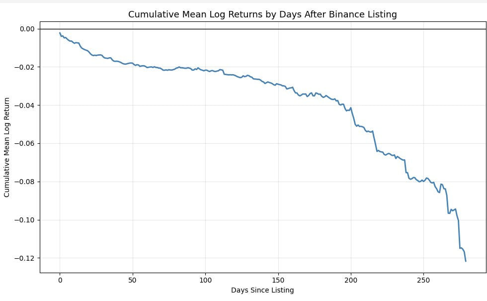 This chart's a real eye-opener! It tracks every coin listed on Binance from January 2025 to October 8, right before that market wipeout that sent altcoins plummeting by 40% to a jaw-dropping 99%! 📉 Even before the shake-up, the average coin was already down about 12% since it hit the market. Talk about a rough ride! 😬 Those returns are measured in cumulative log terms—think of it as tracking the true pain of losses over time. The trend is clear: most new listings just can’t keep their shine. 💰 When a new token drops on Binance, rookie traders race in thinking they’ve struck gold. But remember this chart! History has a way of repeating itself; excitement cools, liquidity vanishes, and prices slowly fade away. So how do we turn this knowledge into action? For starters, maybe stop buying 99% of the coins that drop on Binance. If you're feeling confident in your skills, consider shorting those altcoins a few months post-listing if you spot bearish vibes! 🐻💸