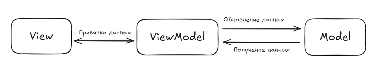 MVVM — это шаблон проектирования, который разделяет код на три независимые части:Model (Модель) - View (Представление) - ViewModel (Модель Представления)